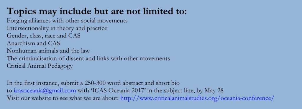 Alliance building across social movement groups is an important aspect of social movement dynamics, contributing to their capacity to promote social change for both nonhuman and human animals. Within the Oceanic region of the animal liberation movement, forging alliances and building an awareness of intersectionality is crucial, yet remains scarce within activist communities. No one group an achieve liberation on its own, or emancipate other oppressed communities, making alliance building vital. This conference seeks to foster new discussions on how to forge alliances and raise awareness of intersectionality within a Critical Animal Studies framework. Understanding what inspires and facilitates collaboration and how movements form alliances, or fail to do so, is a crucial aspect of achieving social change at a broader level.