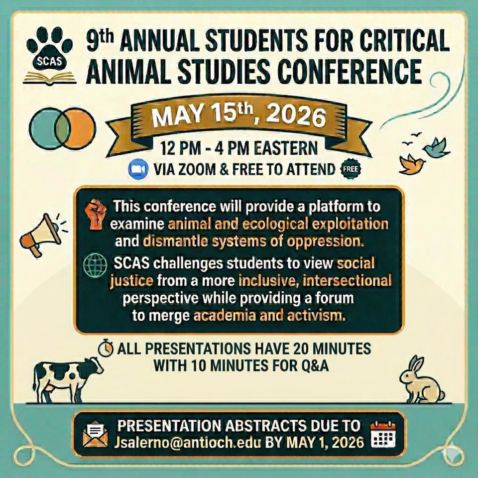 • May 15, 2026 – 9th Annual Students for Critical Animal Studies Conference – via Zoom and Free